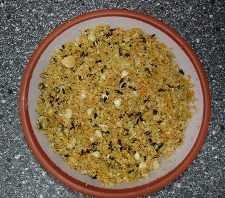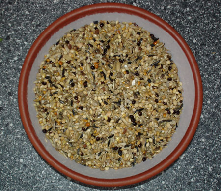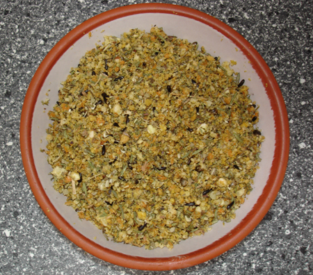 Mein Keimfutter besteht aus dreizehn Einzelsaaten. Diesem Keimfutter mische ich gerne getrocknete, zu Pulver zerkleinerte Kräuter, bei.